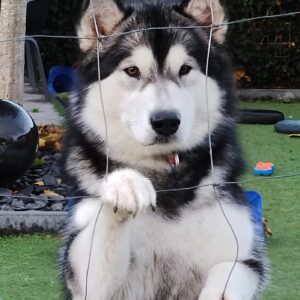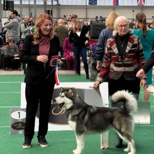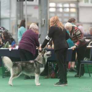 10 months old, still a puppy in every way, a true girl, correct type, topline sufficiently sloping, well-formed head, excellent eyes and ears, sufficient forechest, harmoniously angulated, well-set and carried bushy tail, beautiful snow foot, excellent muscled, good coat in nature, moves easily and parallel.
